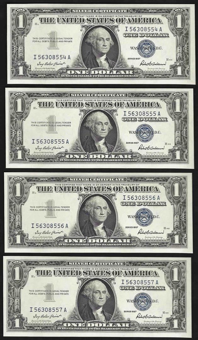 One Lot of (4) Consecutive 1957 $1 Silver Certificate Notes Uncirculated.