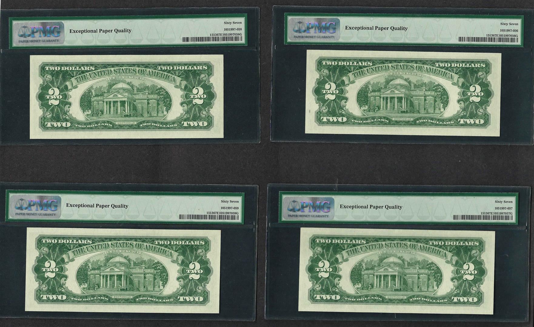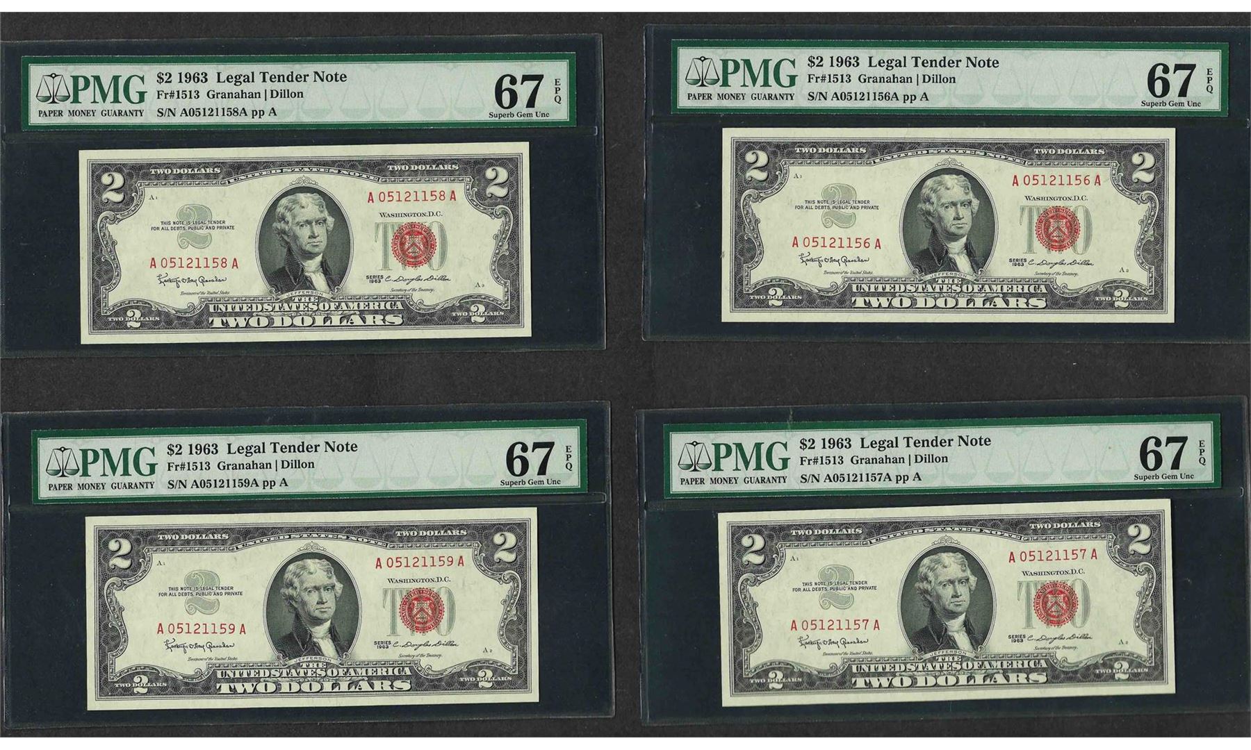 One Lot of (4) Consecutive 1963 $2 Legal Tender Notes PMG Superb Gem Uncirculated 67EPQ. PMG Certified.