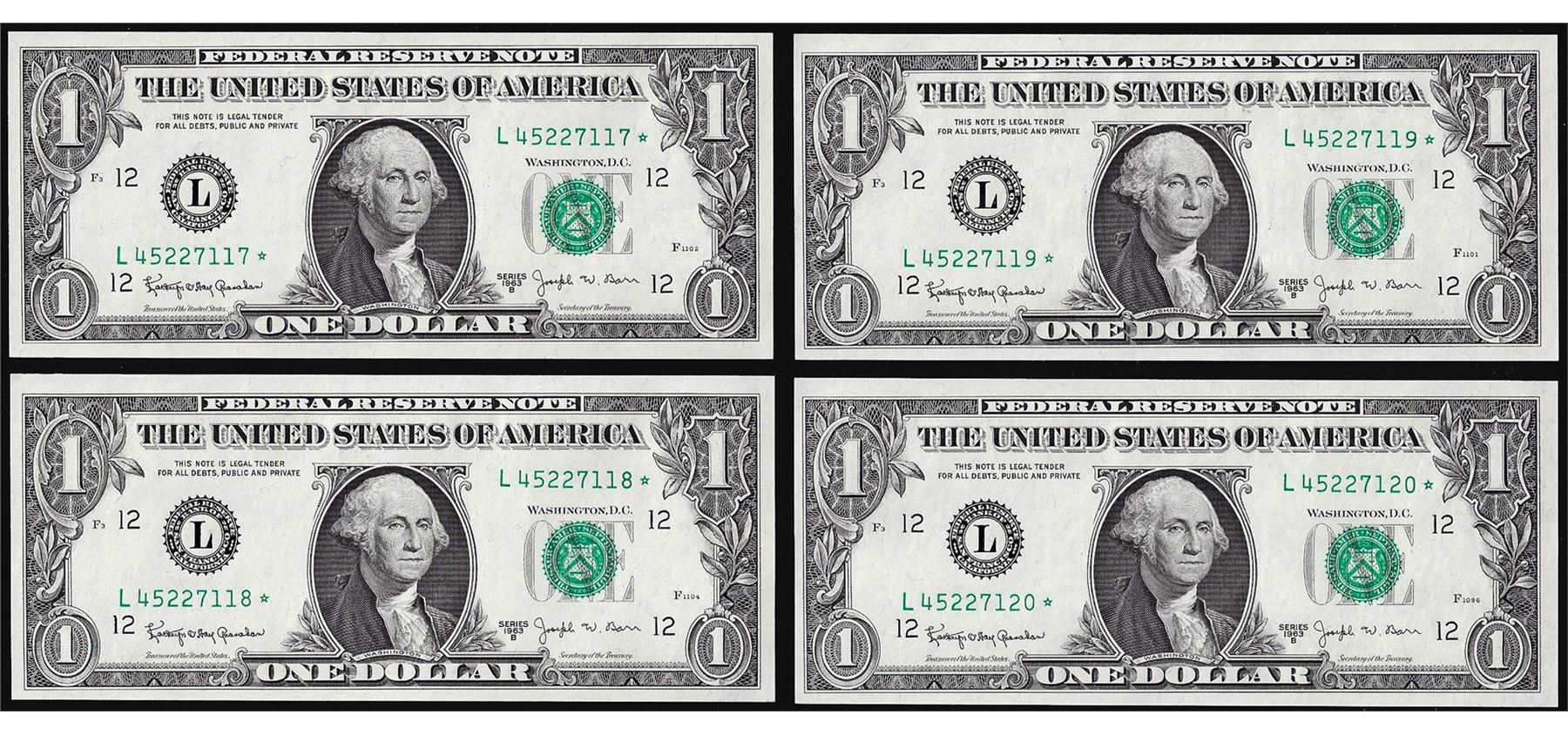 Lot of (4) Consecutive 1963B $1 Federal Reserve Barr STAR Notes