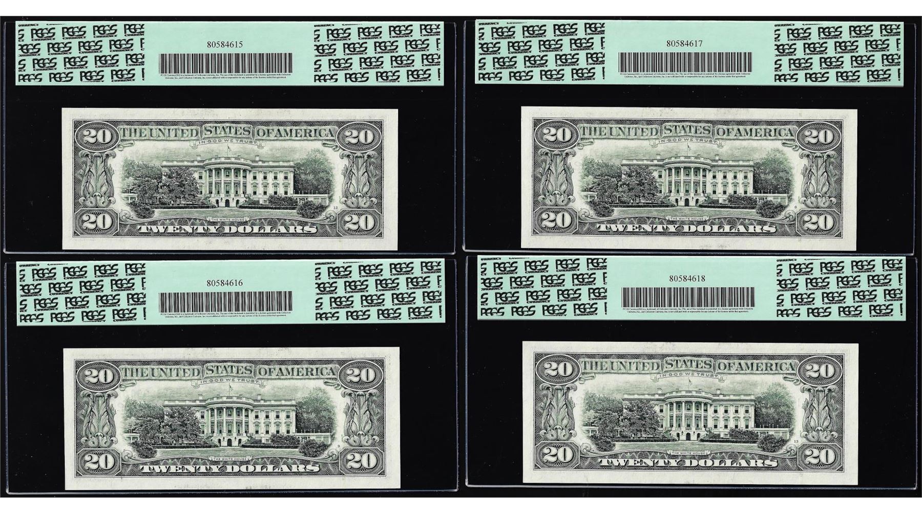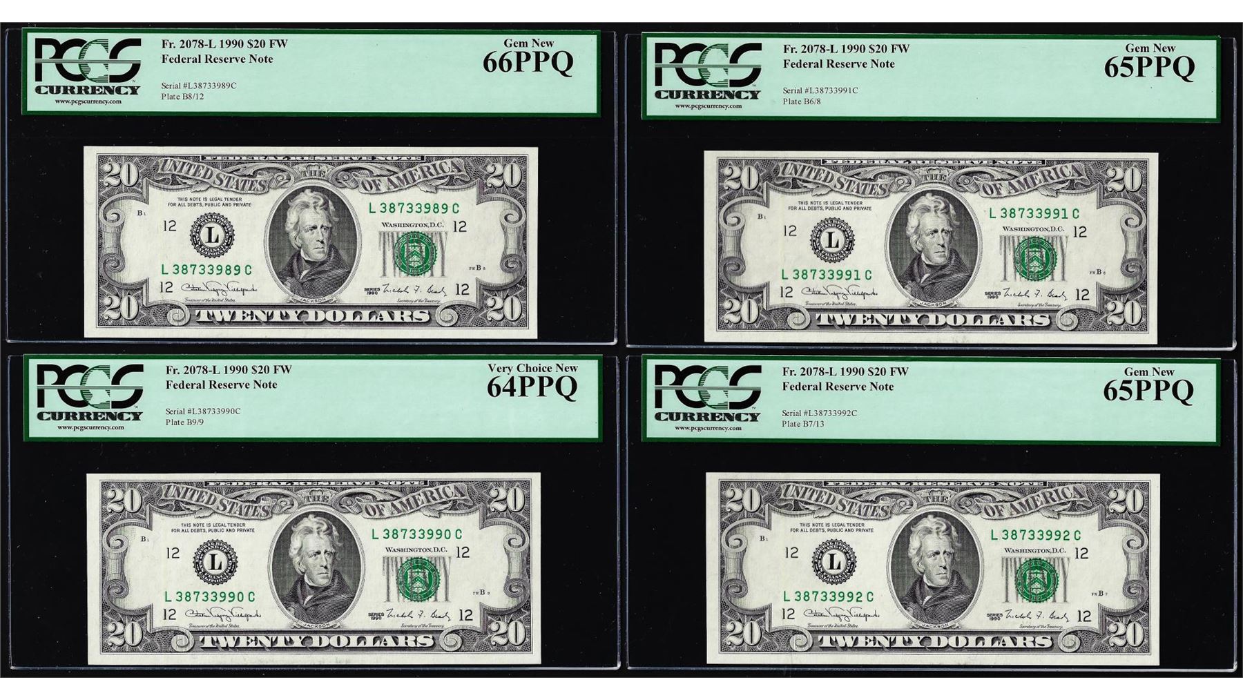 Lot of (4) Consecutive 1990 $20 Federal Reserve Notes Fr.2078-L PCGS New 64/65/66PPQ