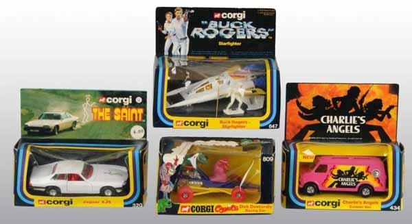Description Includes number 647 Buck Rogers Star Fighter, number 434 Charlie's Angels Van, number 320 Saint the Saint Jaguar, and number 809 Dick Dastardly Racing Box Car. All original boxes are included with plastic on Saint car ripped open and some denting on Dick Dastardly boxcar. Condition (Very Good - Excellent).
