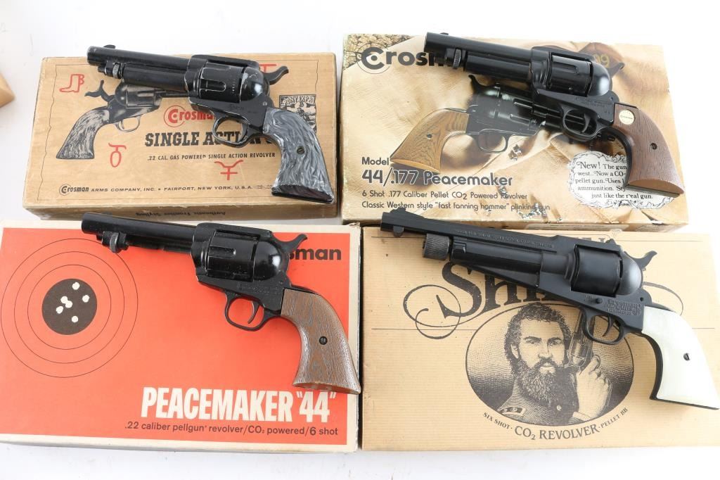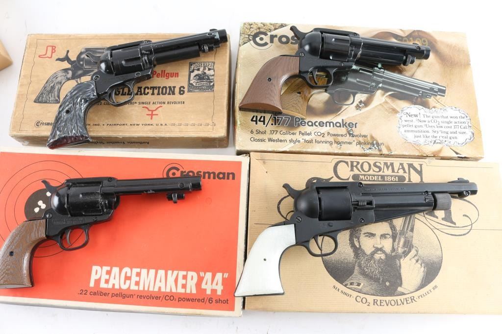 Lot of 4 Airguns: 1) Crosman model 1861 single action .177 Cal. full metal Co2, with a pair of white panel grips and a pair of brown replacement panels in factory box. 2) Crosman Peacemaker 44 .22 Cal. full metal CO2, comes in factory box, 3) Crosman Peacemaker 44 .177 Cal. full metal CO2 in factory box, 4) Crosman Single Action 6 .22 Cal full metal CO2 in factory box. All air guns in very good condition except Single Action with considerable wear all over.