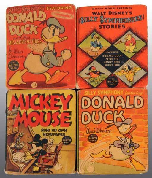 Description Includes #1111 Silly Symphonies Stories, #1441 Donald Duck and his Adventures, #1169 Donald Duck, and #1409 Mickey Mouse Runs His Own Newspaper. Condition (Very Good).