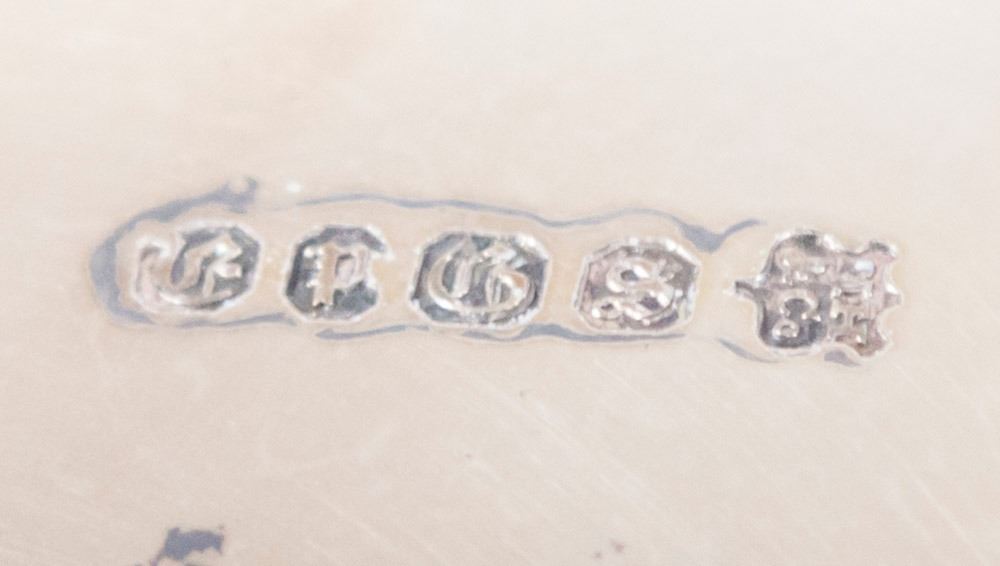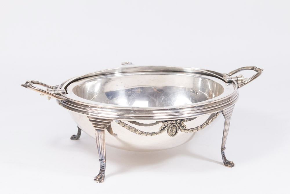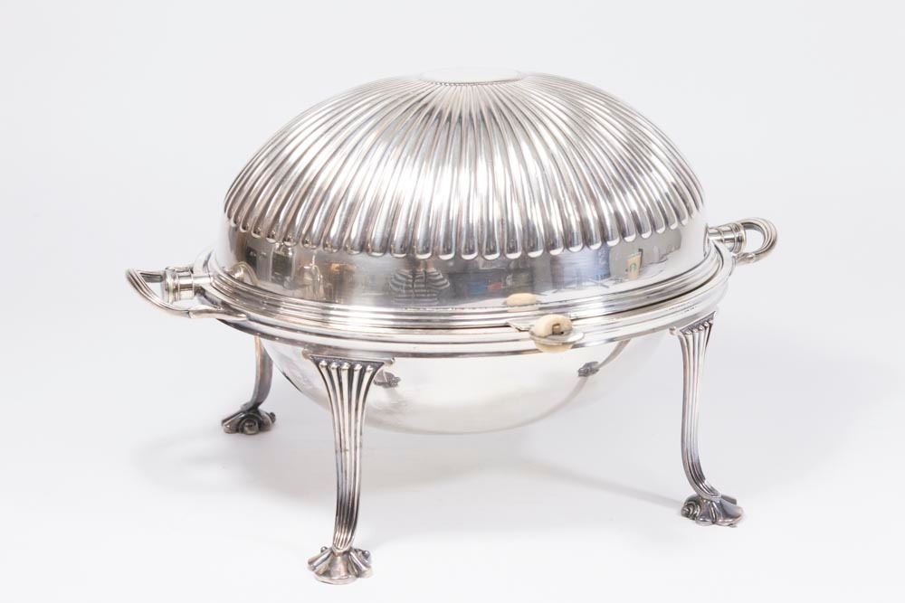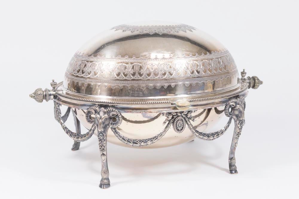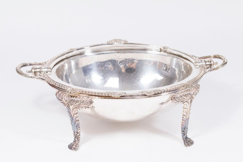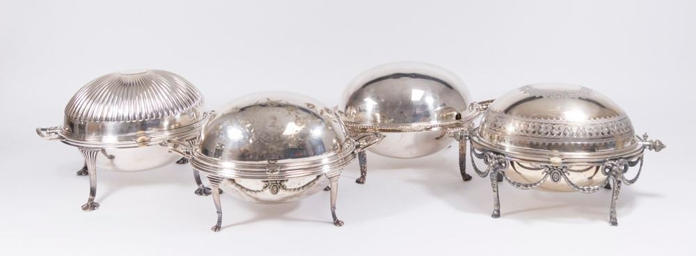 One stamped Elkington. All approx. 9" H x 15" W x 9" D. Losses to wood on handles of two.