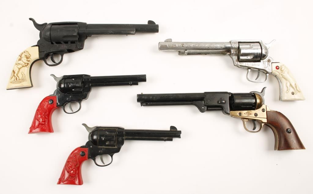Also a reproduction prop .36 caliber black powder revolver, a two gun holster set and two single cowboy toy guns and two holsters.