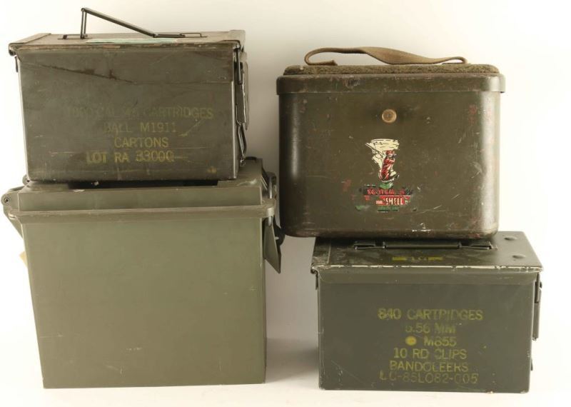 (1) plastic and (3) metal including a Scotsman Swivel Seat Shell Box. Pull button on front and swivel seat pops up. Shows age and use, decal is mostly worn off.