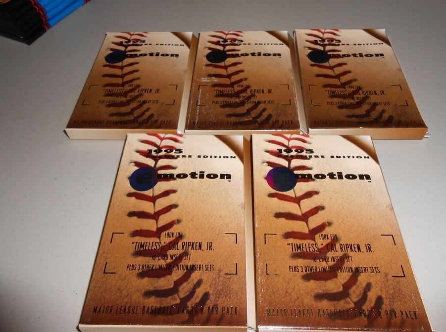 Each of these Factory Sealed Packs contains (8) 1995 Fleer Emotion Baseball Cards. Look for Cal Ripken Jr. "Timeless" Insert Cards.