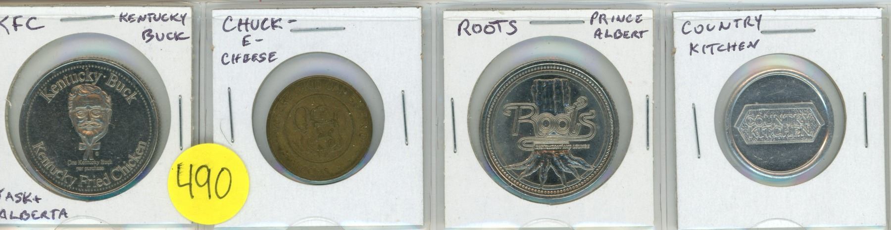 Lot of 4 Fast Food Tokens. Includes Kentucky Fried Chicken, Chuck – E – Cheese, Roots Prince Albert & Country Kitchen.