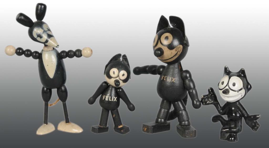 Includes two Felix wooden jointed figures marked "Copyright 1922 by Pat Sullivan" on feet. Both have original ears, tails and "Felix" decals on chests. Also includes cast iron hood ornament Felix the Cat figure and wooden-jointed Ignatz Mouse with original ears and tail. Overall moderate wear to all pieces. Condition (Very Good). Size Largest: 6" T.