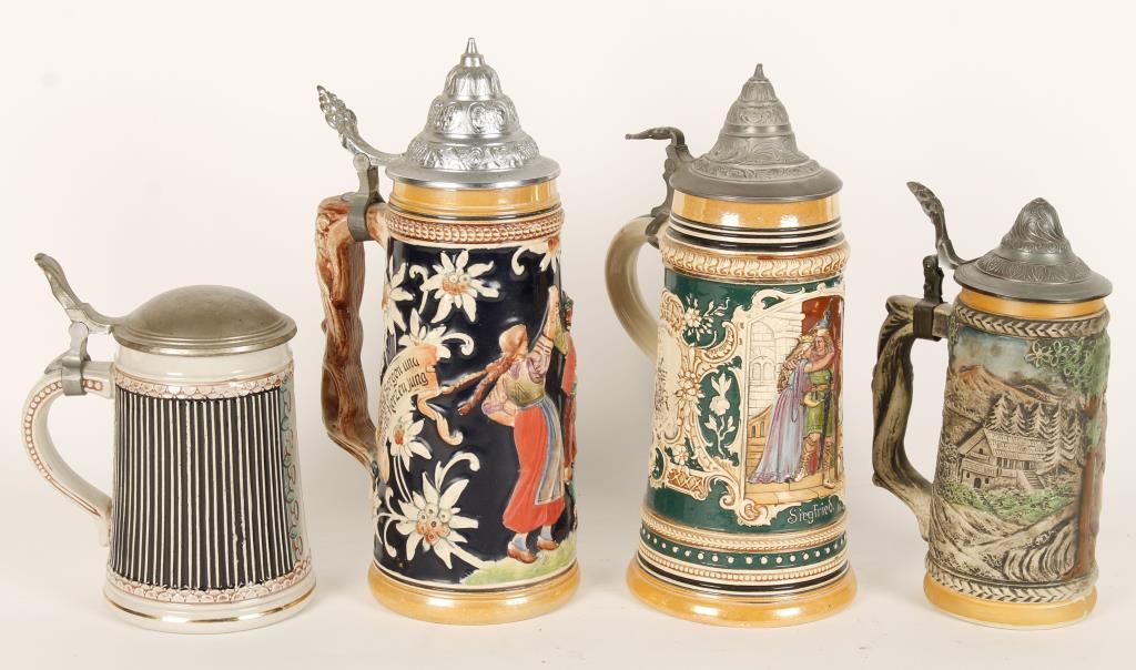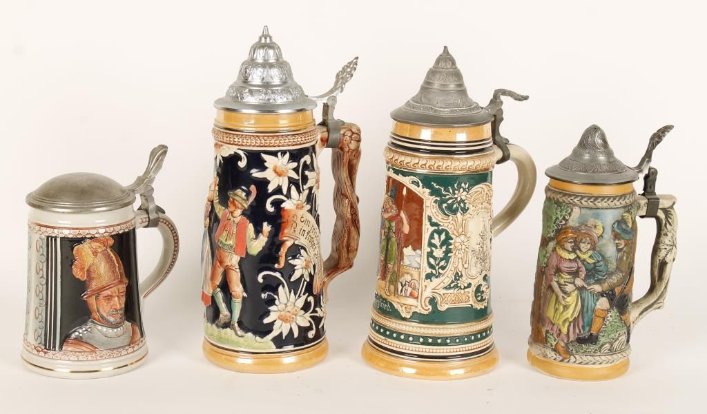 All with pewter lids includes a dancing couple, a knight and a palace scene.