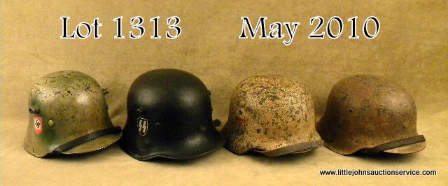 Lot of 4 German WWII helmets; Early Allgemeine SS double-decal helmet, decals not original, headliner replaced, body of helmet is authentic. M35 double decal dutch SS volunteers helmet with original body and replacement liner. Transitionalfield police helmet repainted, redecaled, strap and liner replaced. M40 combat helmet with replaced liner and subdued camouflage. Est: $750 - $1,500