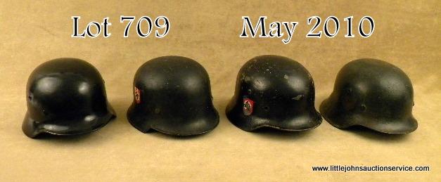 Lot of 4 German helmets with replaced decals. Three with liners, in various conditions. One repainted. Est: $300 - $500