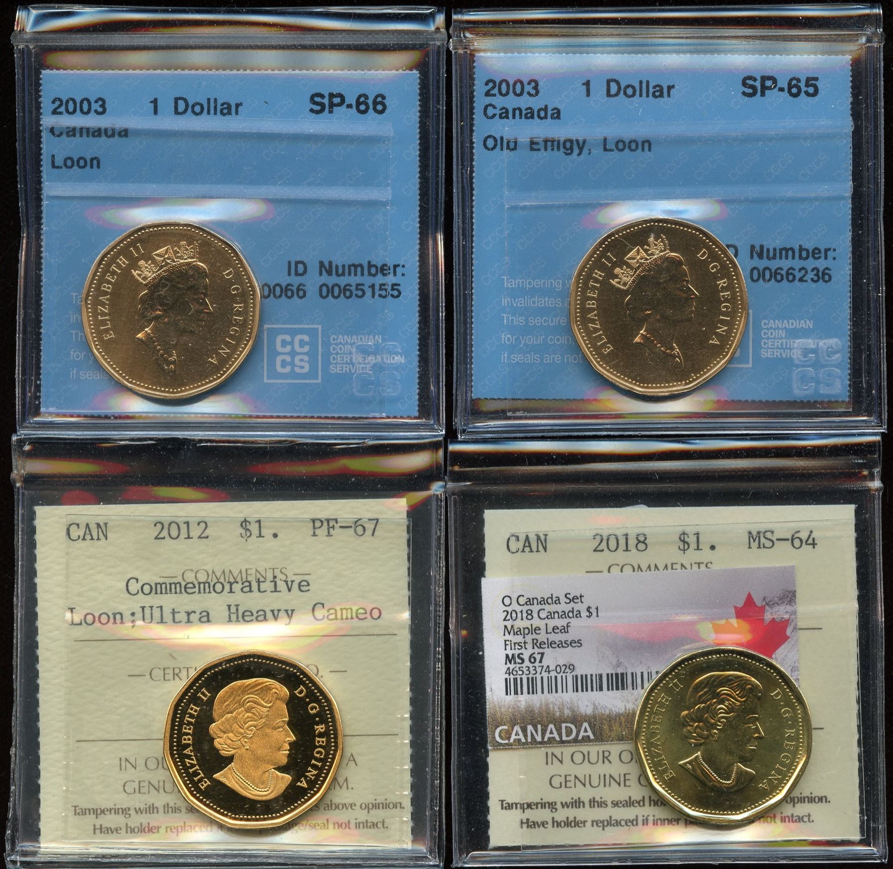 Includes: 2003 Specimen CCCS SP-66. 2003 Specimen Old Effigy CCCS SP-65. 2012 Proof Commemorative ICCS PF-67, UHC. 2018 O Canada ICCS MS-64, with NGC certificate (MS-67). 4 Coins.