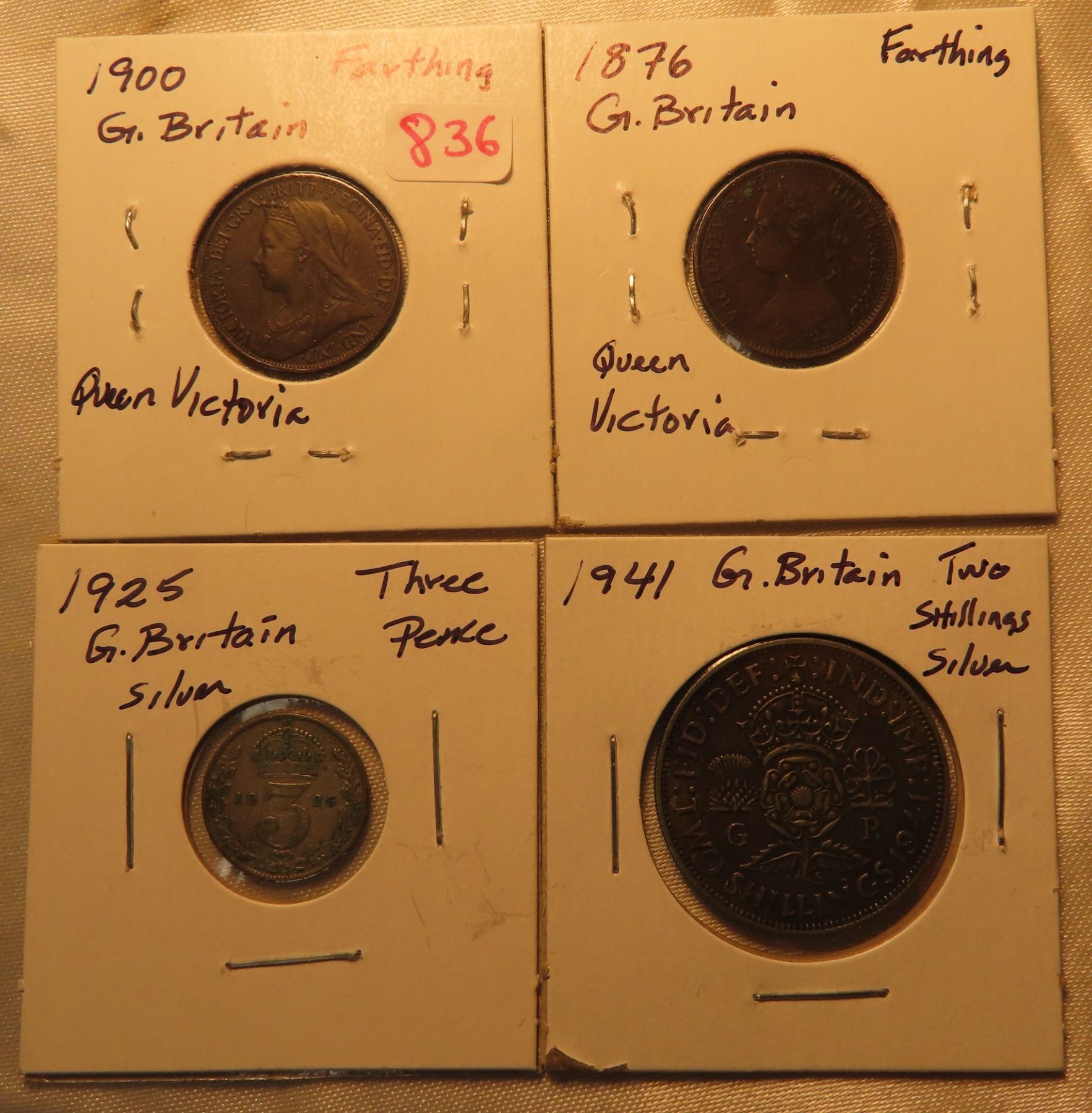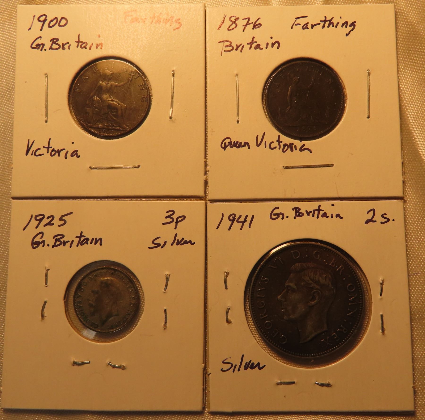 Lot of 4 Great Britian Coins: 1876 & 1900 Farthing, 1925 Three Pence & 1941 Two Shillings (silver)