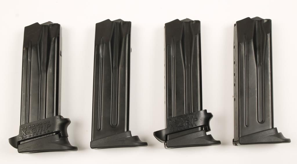 With 2 "X-Grip" Adapters. Stamped with thirteen round capacity on the back. Three are marked with "P2000 US USP Comp. 9x19" and one is marked with "P2000 subc. .40/9x19".