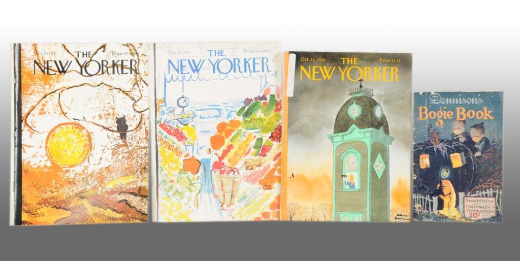 Consists of Dennison's Bogie Book and three New Yorker magazines. Dennison's illustrated with Halloween decoration and entertainment suggestions. Two New Yorker October issues dated 1971 and one 1988. Condition (Excellent). Size 11 - 1/2" H.