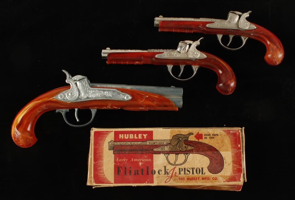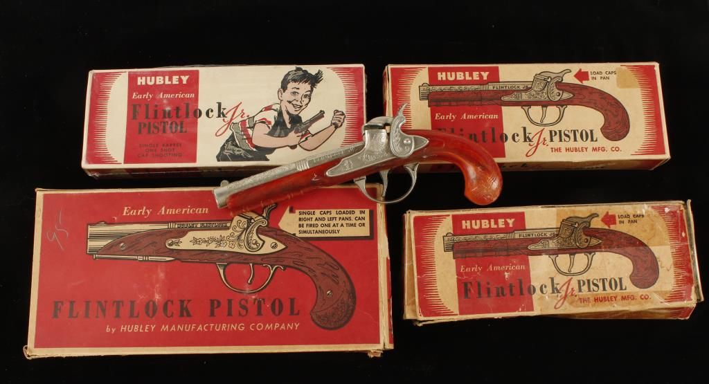 Includes: (3) Single barrel pistols, and (1) double barrel pistol. Also includes the original boxes. The guns are in overall good condition, the boxes have some damage.