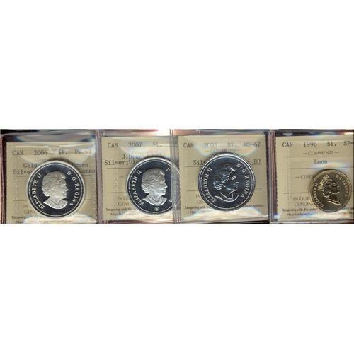 Lot of 4 ICCS coins. Includes 1996 $1 "Loon" SP67, 2005 $1 "Flag" MS67, 2006 $1 "Gold Vicky Cross" PF67 UHC, 2007 $1 "J.Brant Gold plate" PF67 UHC.
