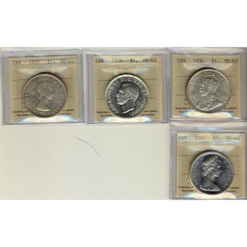 Lot of 4 ICCS graded MS-63 $1; 1936, 1939, 1957, 1967