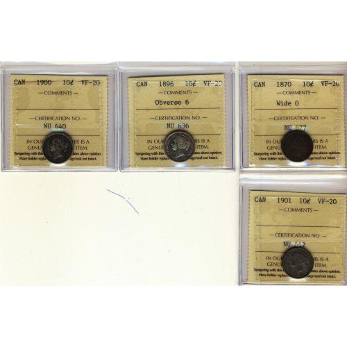 Lot of 4 ICCS graded VF-20 10¢; 1870 Wide O, 1896 Obv#6, 1900, 1901