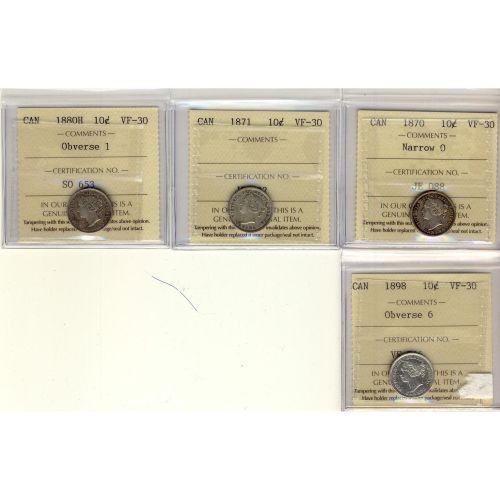 Lot of 4 ICCS graded VF-30 Ten cents; 1870 Nar.O, 1871, 1880H Obv#1, 1898 Obv#6