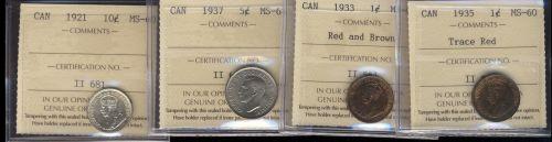 Lot of 4 ICCS graded coins. Small cent; 1933 MS62RB, 1935 MS60, Five cents; 1937 MS64, Ten cents; 1921 MS60,