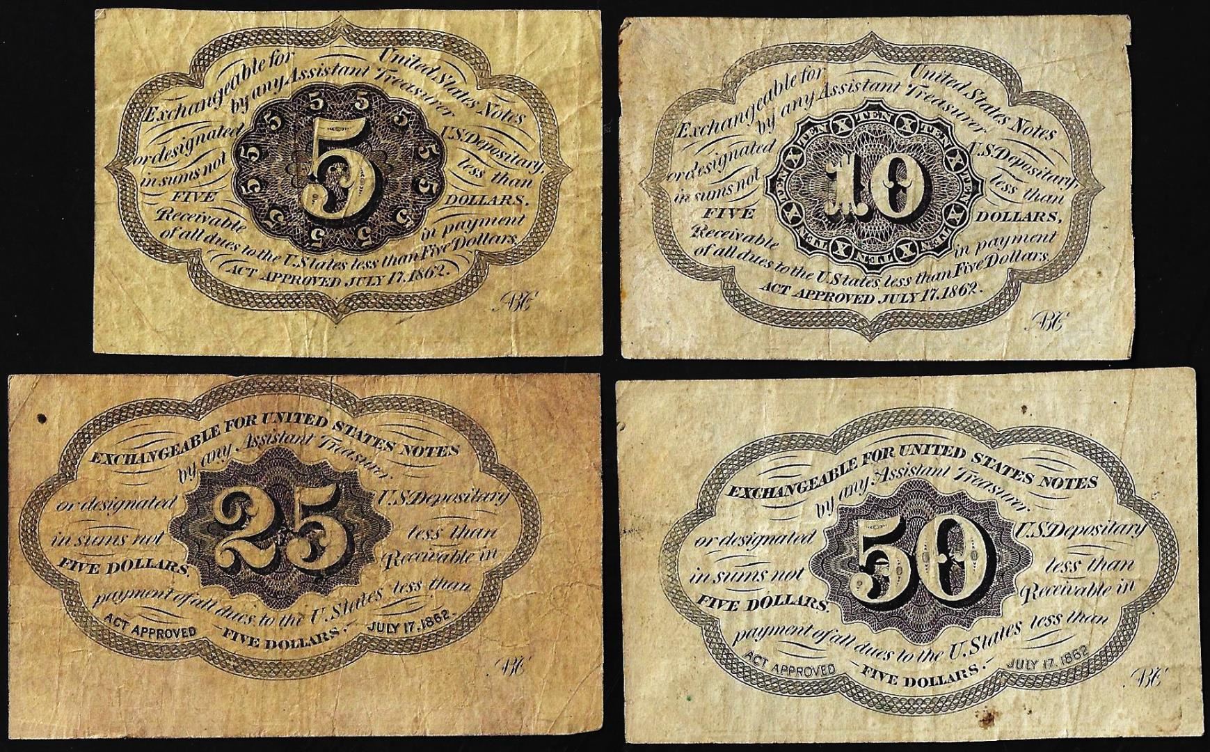 Lot of (4) July 17, 1862 First Issue Fractional Currency Notes