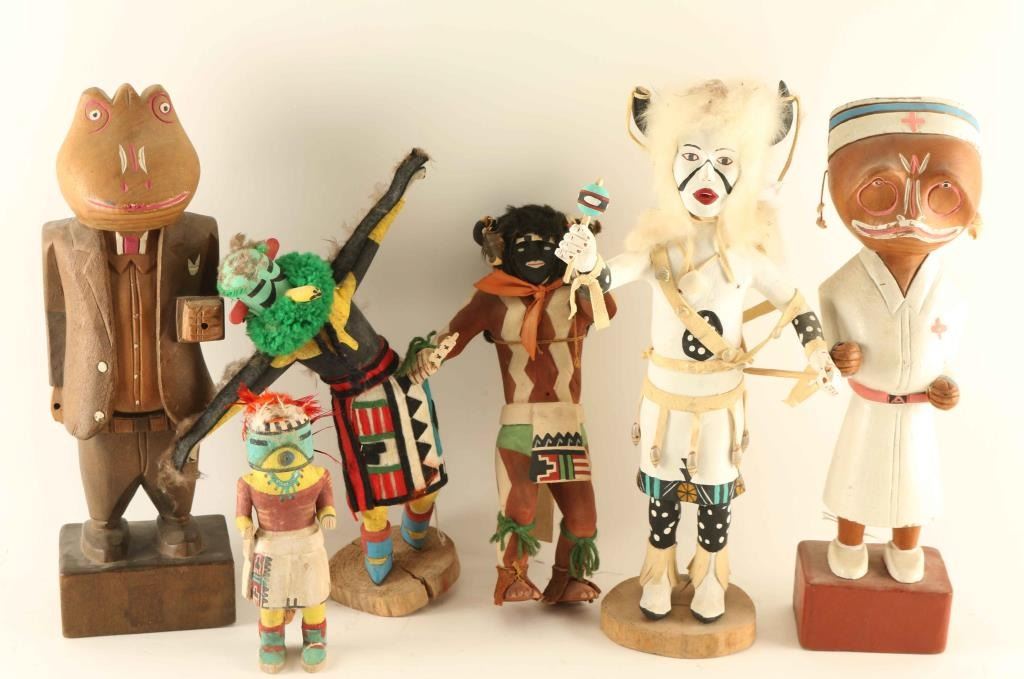 Including; dancing eagle Kachina 11 1/2" tall, buffalo Kachina 11" tall, white buffalo-spear has broken off 14 1/2" tall, vintage painted Kachina-missing hands 7" tall frog doctor figure in brown wood 14" tall, frog nurse figure in white uniform 14" tall, dancing