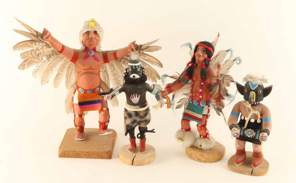 Lot includes two Kachinas from Leonard Pete titled "Eagle Dance" and Cheyenne Warrior". Also includes and unsigned Kachina titled "Majtop Death Fly" and an un-marked Kachina.