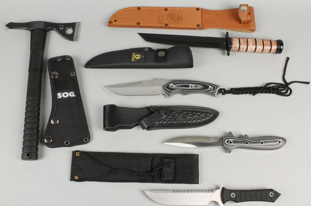 Including: 1 Smith & Wesson SWMB micarta boot with leather sheath; 1 Cateye EYE009, with nylon sheath; 1 Leatherneck CO038B; 1 SOG Fasthawk F06-N; and 1 knife with black handle and nylon sheath KS-7842-2.