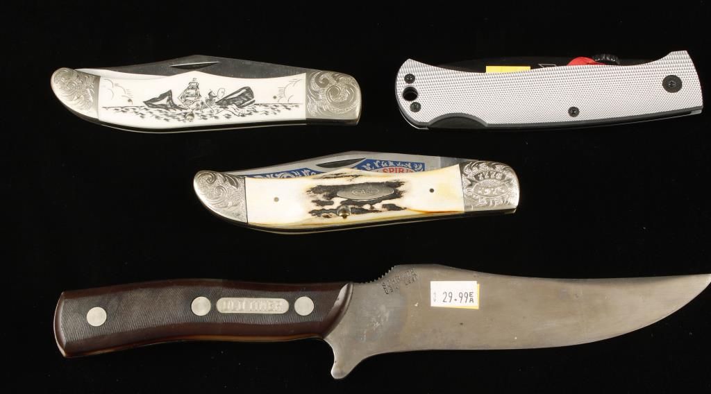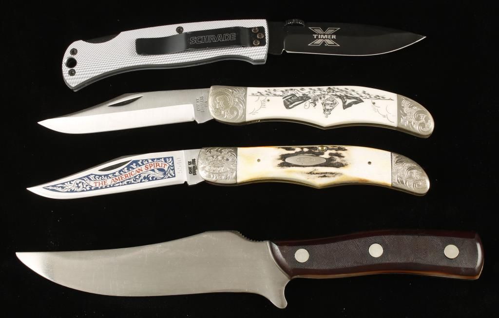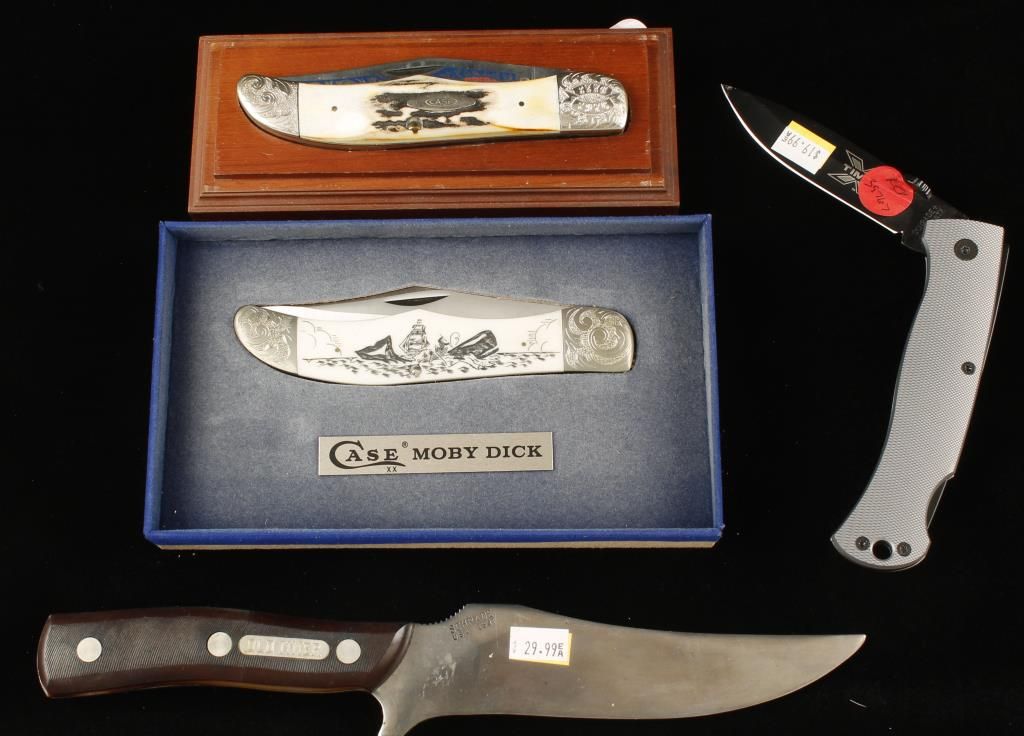 Two from Schrade and two from Case. The Schrades are a folding lock blade "X Timer" and a fixed 5.75" blade with scabbard "Old Timer". The Case knives are in display cases and are; a Case XX Bicentennial Folding lock blade with "The American Spirit" on the blade, and the other is also a Case XX folding lock blade called the "Moby Dick" with scrimshawed scene on bone scales.