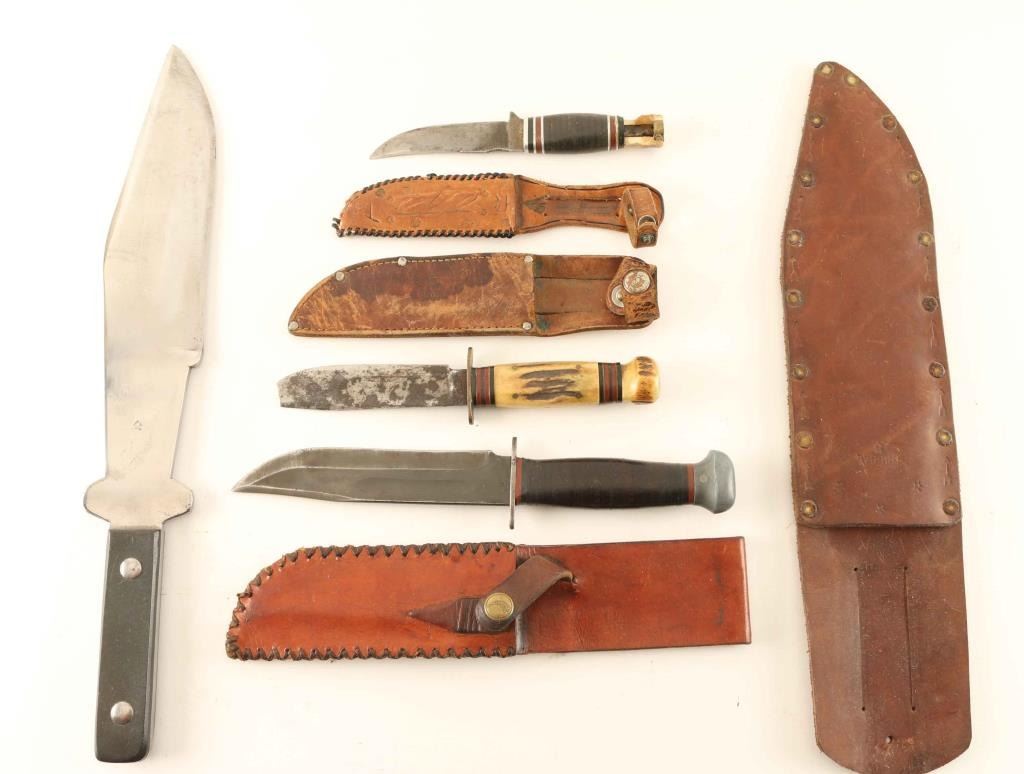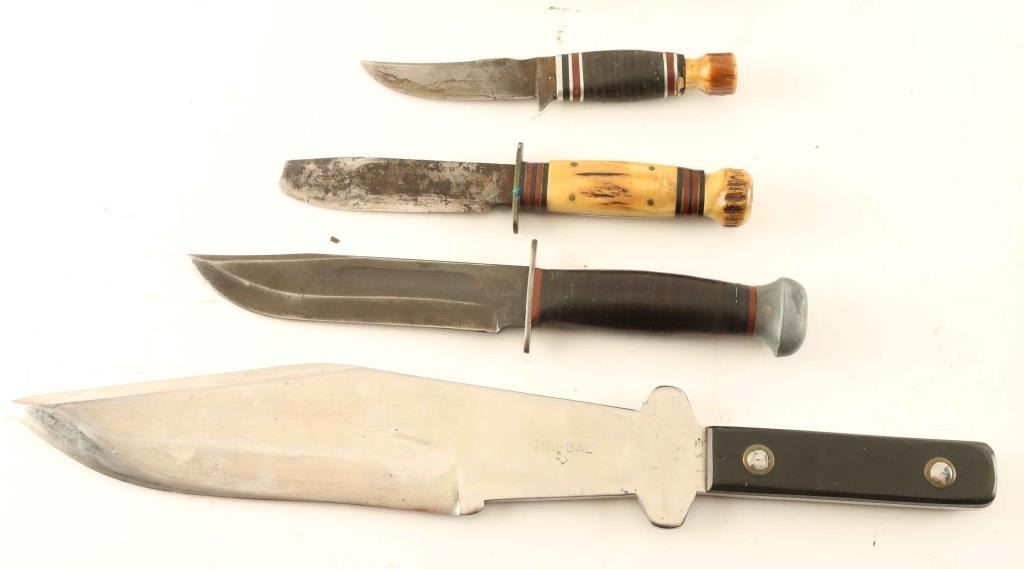 (1) Large Bowie And Three Other Smaller Skinner, One Has A Broken Top All With Sheaths.