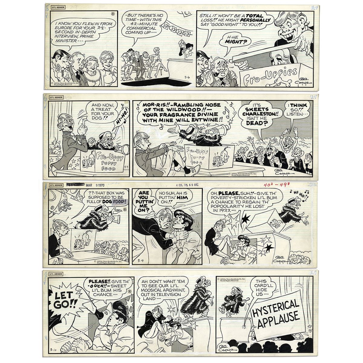 Lot of 4 ''Li'l Abner'' 1970 Comic Strips Drawn & Signed by Al Capp, Who Sketches on Versos -- With Abner, Skeets Charleston, Tommy Wholesome -- 19.75'' x 6.25'' -- Toning & White Out, Near Fine