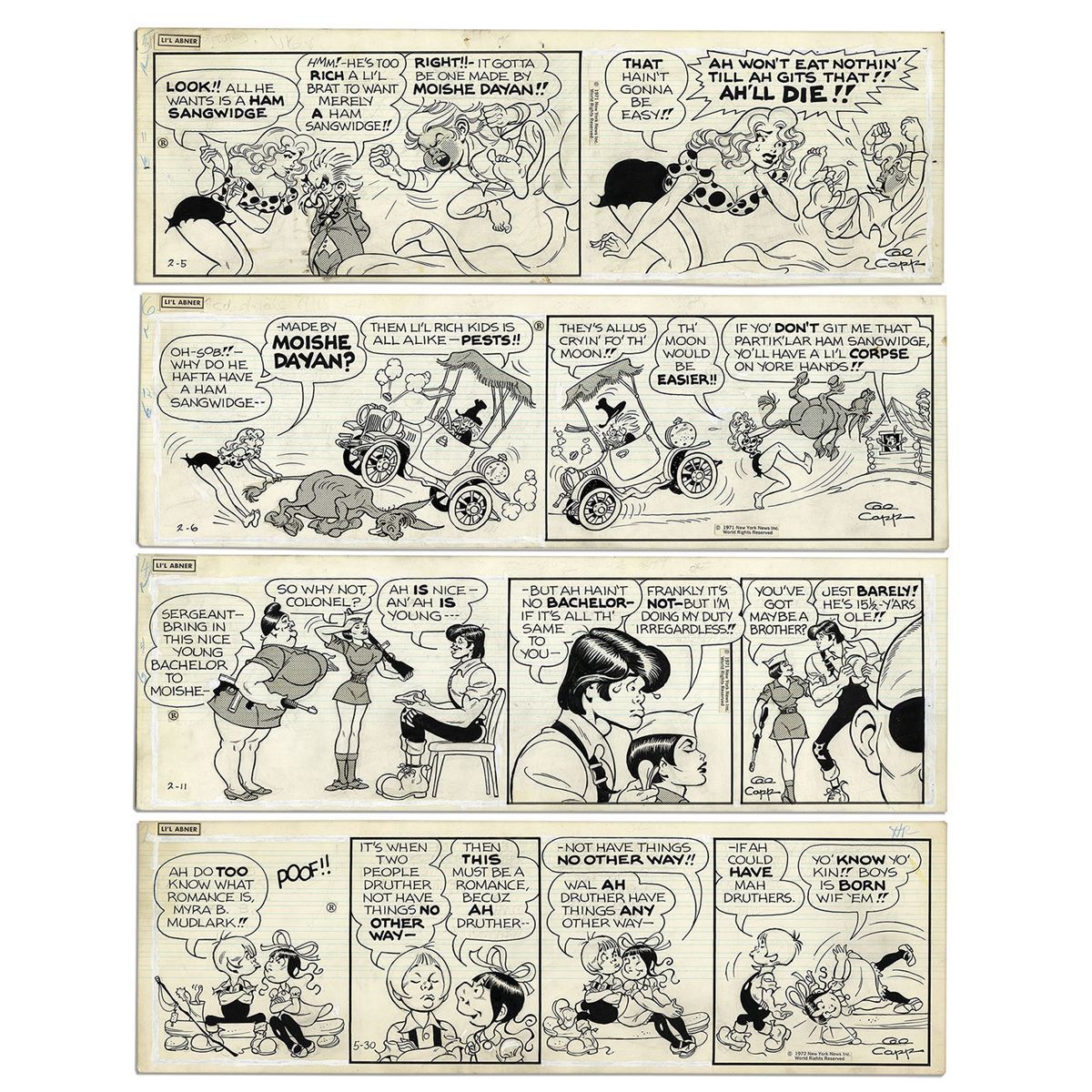 Lot of 4 ''Li'l Abner'' 1971 Comic Strips Drawn & Signed by Al Capp -- Featuring Honest Abe, Myra B. Mudlark, Abner & Daisy Mae -- 19.75'' x 6.25'' -- Toning & White Out, Near Fine