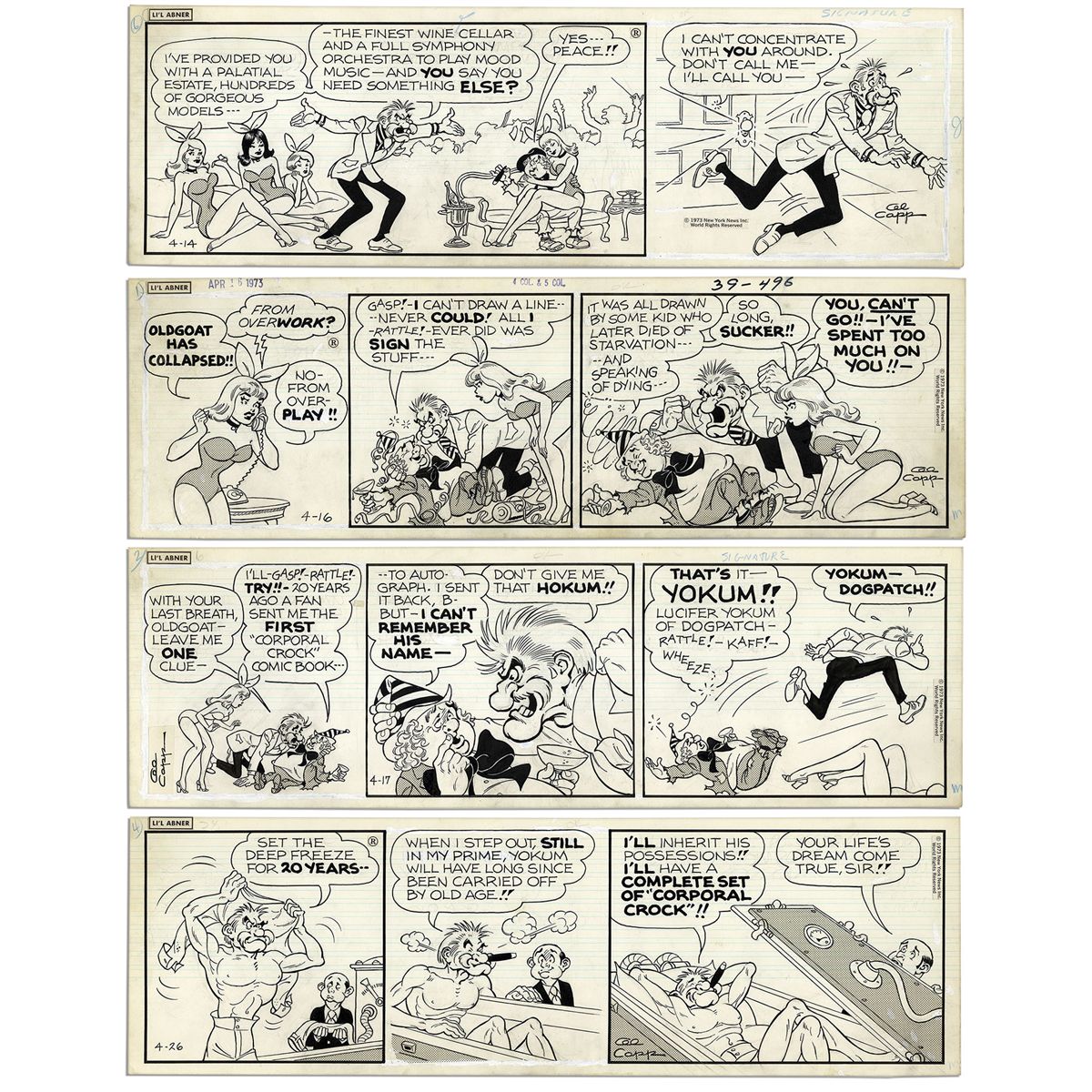 Lot of 4 ''Li'l Abner'' 1973 Comic Strips Featuring Hefner Spoof -- Hand-Drawn & Signed by Al Capp, Who Adds Pencil Sketches to Versos of 3 -- 19.75'' x 6.25'' -- Toning & White Out, Near Fine