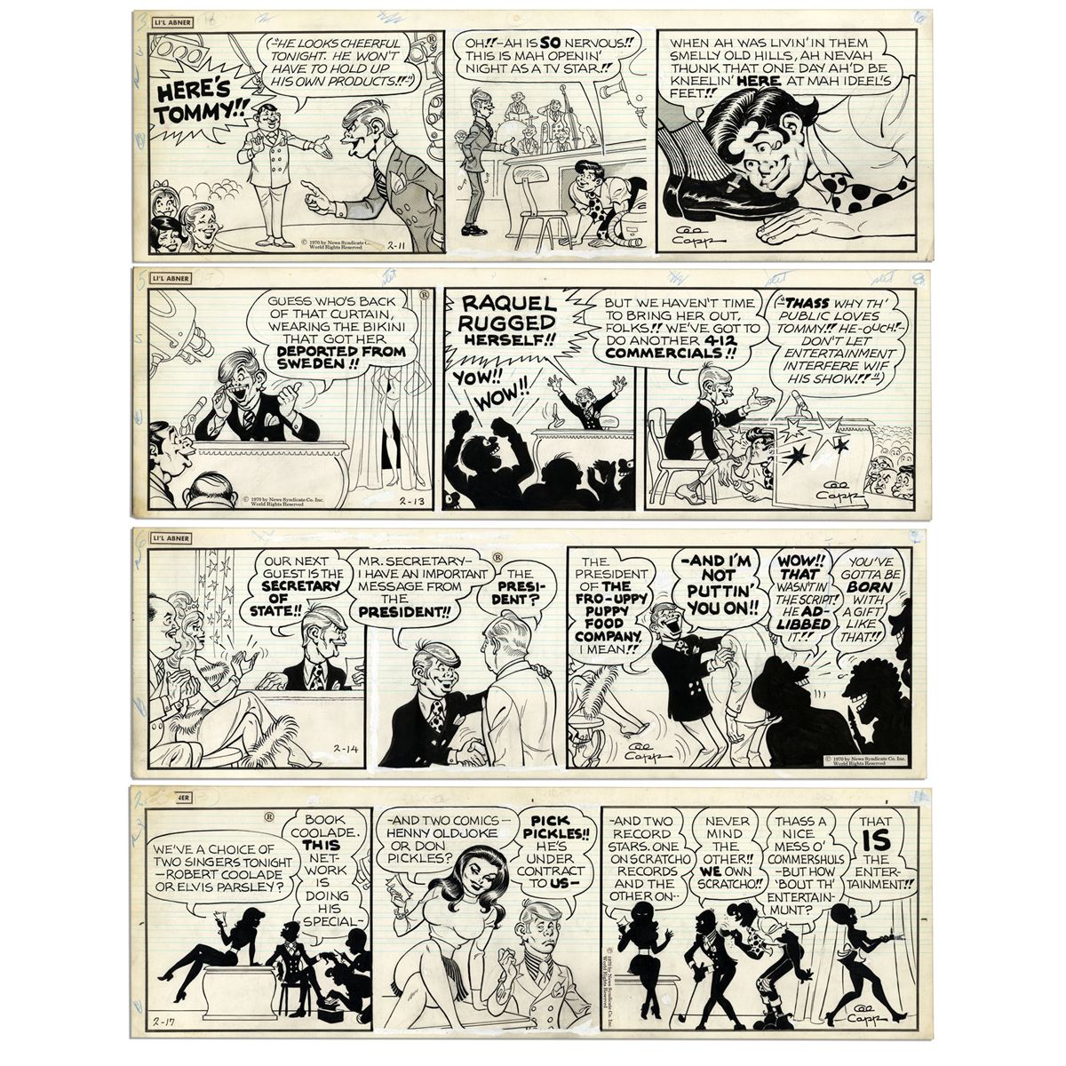 Lot of 4 ''Li'l Abner'' Comic Strips From 1970 -- Hand-Drawn & Signed by Al Capp Who Adds Pencil Sketches to Versos of All 4 -- 19.5'' x 6.25'' -- Toning & White Out, Near Fine