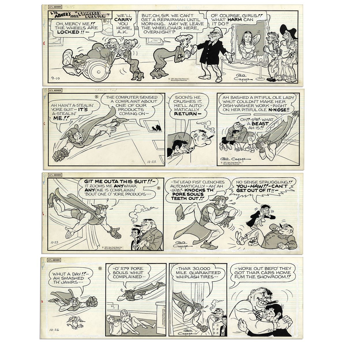 Lot of 4 ''Li'l Abner'' Comic Strips From 1971 Hand-Drawn & Signed by Al Capp, Who Adds Sketches to Versos of 3 -- With ''Fearless Fosdick'' -- 19.75'' x 6.25'' -- Toning & White Out, Near Fine