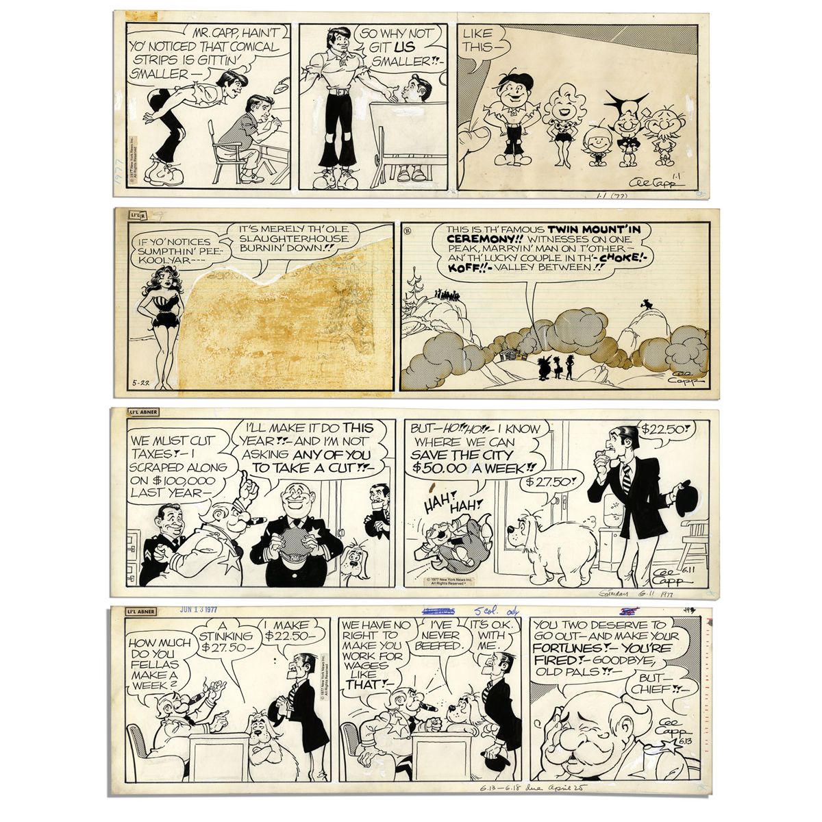 Lot of 4 ''Li'l Abner'' Comic Strips From 1977 Hand-Drawn & Signed by Al Capp -- With Abner, Capp's Self-Sketch, Mammy, Pappy & Moonbeam -- 19.75'' x 6.25'' -- Toning & Missing Segment, Good