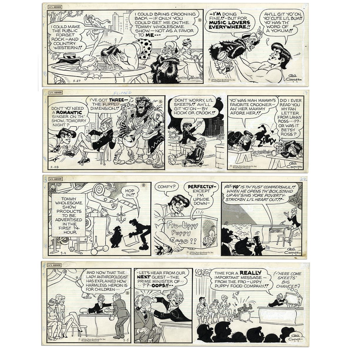 Lot of 4 ''Li'l Abner'' Comic Strips Hand-Drawn & Signed by Al Capp Featuring Abner, Tommy Wholesome & Skeets -- 27, 28 February & 4, 5 March 1970 -- 23'' x 6.75'' -- White Out, Near Fine