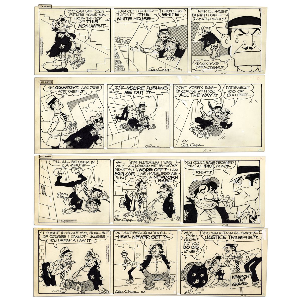 Lot of 4 ''Li'l Abner'' Comic Strips Hand-Drawn & Signed by Al Capp -- From 1-4 November 1977 -- Featuring Fearless Fosdick -- 18.5'' x 6.25'' -- Toning & White Out, Near Fine