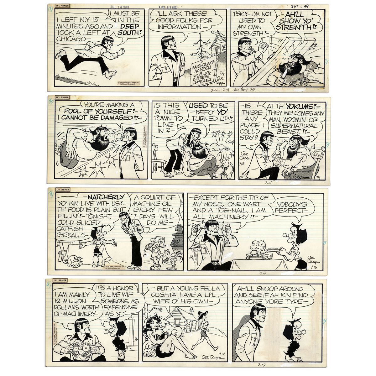 Lot of 4 ''Li'l Abner'' Comic Strips Hand-Drawn by Al Capp From July 1975 -- Featuring 12 Million Do