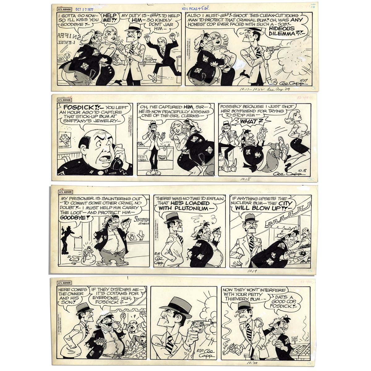 Lot of 4 ''Li'l Abner'' Comics With Fosdick -- 17-20 October 1977, The Very Last Month of The Strip's 43 Year Run -- Drawn & Signed by Al Capp -- 19.5'' x 6.25'' -- Toning & White Out, Near Fine