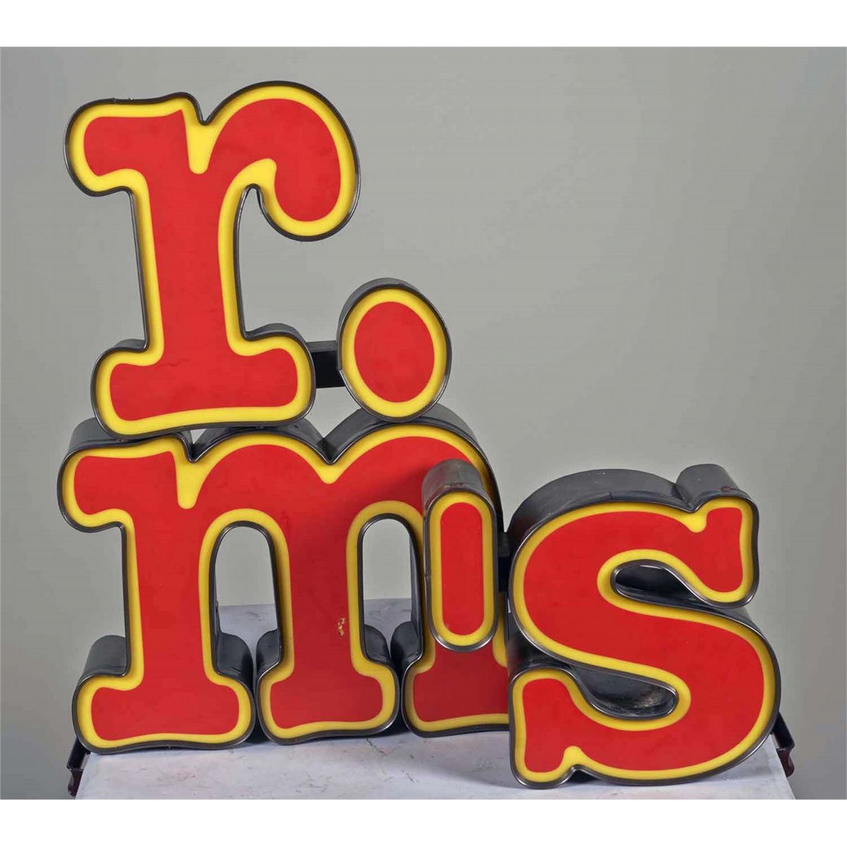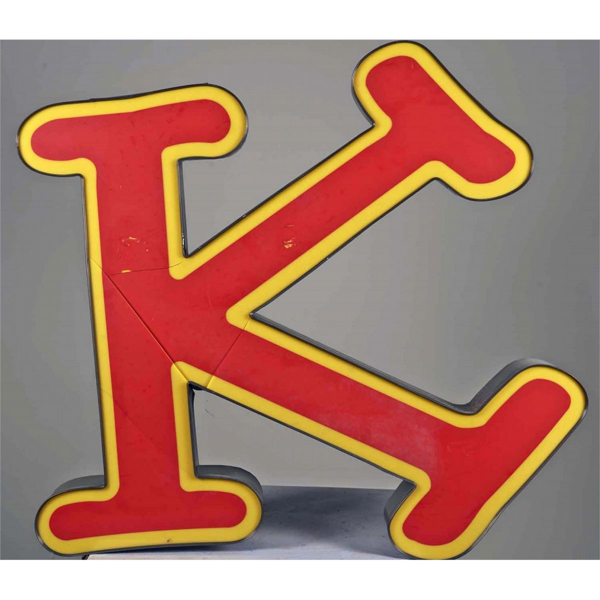 Lot of 4 red letters with yellow outline, "m r. K 's" front of "K"is cracked, c. 1980's Condition Fair - Good Size Largest 38" x 42" x 5".