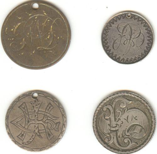 Love tokens: on 1/2 cent Nova Scotia, 5 cents Canadian, USA Dime and China 25 Candareens. Lot of 4 interesting love tokens.