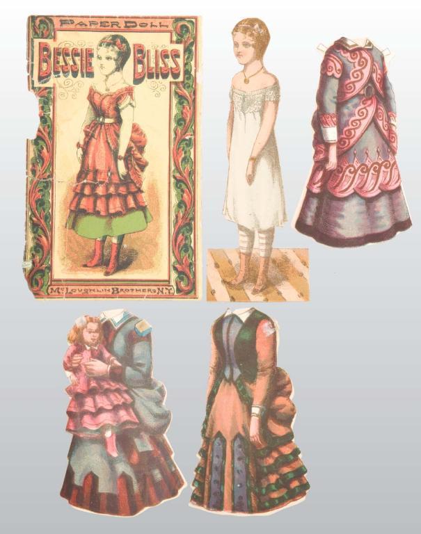 Description ND. "Bessi Bliss", "Lottie Love", "Myra Mild", and "Bertie Bright." No set is complete. The dolls and clothing are in fair to good condition and show average age and wear.