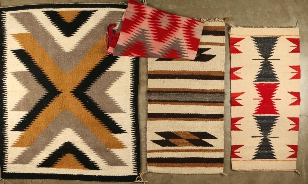 (1) Woven rug with stripes and diamonds in white, brown and black measures 39"x19" shows wear otherwise good. (1) Eye dazzler pattern in gray, red, white. Bleeding of colors and fraying at one corner, measures 37"x19". (1) Rug with hourglass, arrow feather design in white black, red and orange-some small losses otherwise good. Measures 37"x17 1/2". (1) Wool rug with eye dazzler design in black, gray gold and white. shows wear otherwise good. Measures 38"x46"