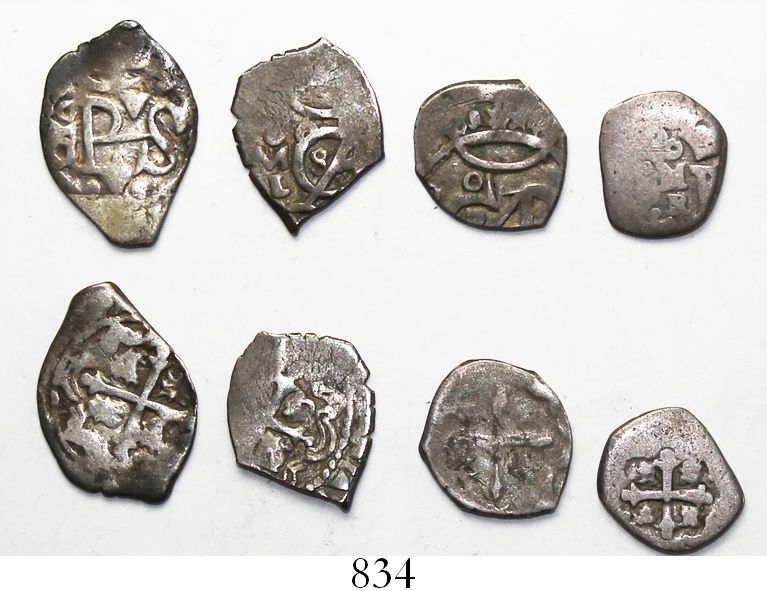 Lot of 4 Mexico City, Mexico, cob 1/2R, various periods and assayers (where visible). 5.73 grams total. One AVG but the others more like VF, generally well toned. Two are pedigreed to the Mark Bir collection (our Auction #6, with original lot-tags #759 and 760).