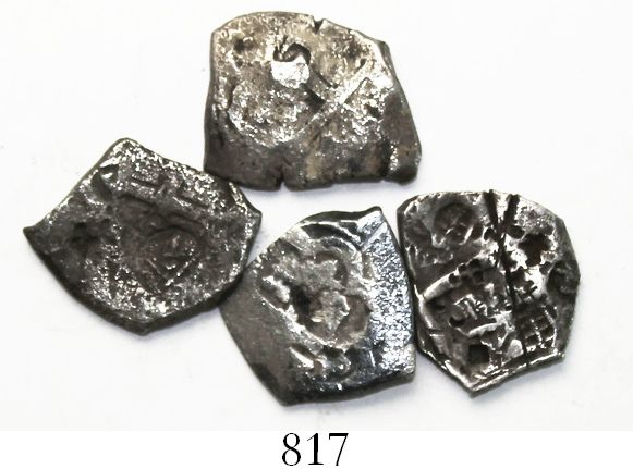 Lot of 4 Mexico City, Mexico, cob 1R, Philip V, assayers not visible, all chopmarked (and some clipped) as from circulation in the Orient, rare. 12.45 grams total. Lots of clear chops (rare on small cobs like this), with minimal but recognizable undercoin details, mostly toned, About Fine on average.