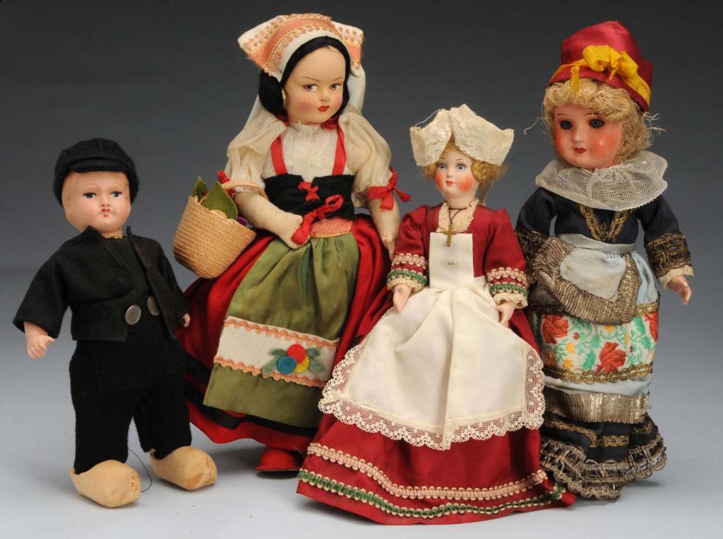Description Largest is a Lenci-type cloth doll representing one of the regions of either southern Italy or Sicily carrying a basket. Also includes one painted bisque doll of French origin on a five-piece composition body, one French celluloid doll representing one of the regions of northwestern France, and one flange-neck composition doll dressed as a Dutch boy with black velvet suit and wooden clogs. Condition (Good - Very Good). Size 12" T.