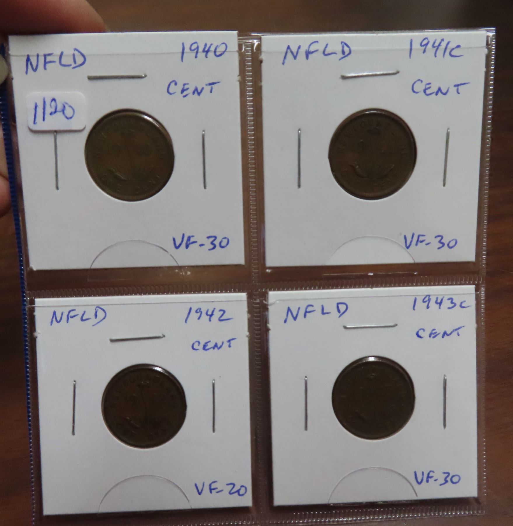 Lot of 4 Newfoundland World War II Small Cents. Includes 1940, 1941C, 1942 & 1943C. Coins grade VF-20 to VF-30.